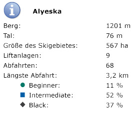 Alyeska ist das am tiefsten gelegene Skigebiet Amerikas und befindet sich an der Südküste Alaskas fast auf Seehöhe. Unberührte Landschaft, massive Gletscher und gigantische Berge bieten sowohl sanfte Abfahrten als auch anspruchsvolle Pisten und Tree-Skiing.