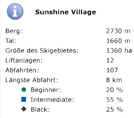 Sunshine Village befindet sich zwischen Banff und Lake Louise. Gepflegte Pisten und der berühmte Powder sorgen für perfekte Voraussetzungen für einen wunderbaren Winterurlaub. Die bis zu acht Kilometer langen Pisten garantieren viel Platz für jeden Skifahrer. Snowboarder können sich auf sehr gepflegte und ausgezeichnete Parks und Halfpipes freuen.