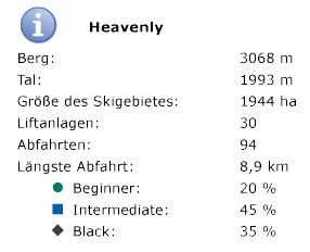 Umgeben von einem klaren, blauen Himmel und direkt am wunderschönen Lake Tahoe gelegen, hat man von Heavenly aus einen fantastischen Blick auf die atemberaubende Landschaft Kaliforniens und Nevadas. Das Skigebiet präsentiert ein weitläufiges Skiareal über zwei Staaten mit großartigen Cruising Runs, herausfordernden Steilhängen und Off-Piste Runs durch die Wälder.