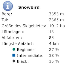 "Snowbird ist eines der anspruchsvollsten Skigebiete der Welt, nur ein Bruchteil der Abfahrten, auf die allwinterlich fast 13 Meter feinster Pulverschnee fallen, wird präpariert. Der ganze Berg mit seinen Felsenkesseln, Mulden, Couloirs, Buckelwänden und lichten Wäldern ist zum Skifahren freigegeben. Nicht umsonst deklinieren Snowbird Kenner: ‚Steep, steeper, Snowbird - deep, deeper, Snowbird‘". (Ski Guide Nordamerika - Reiseführer)